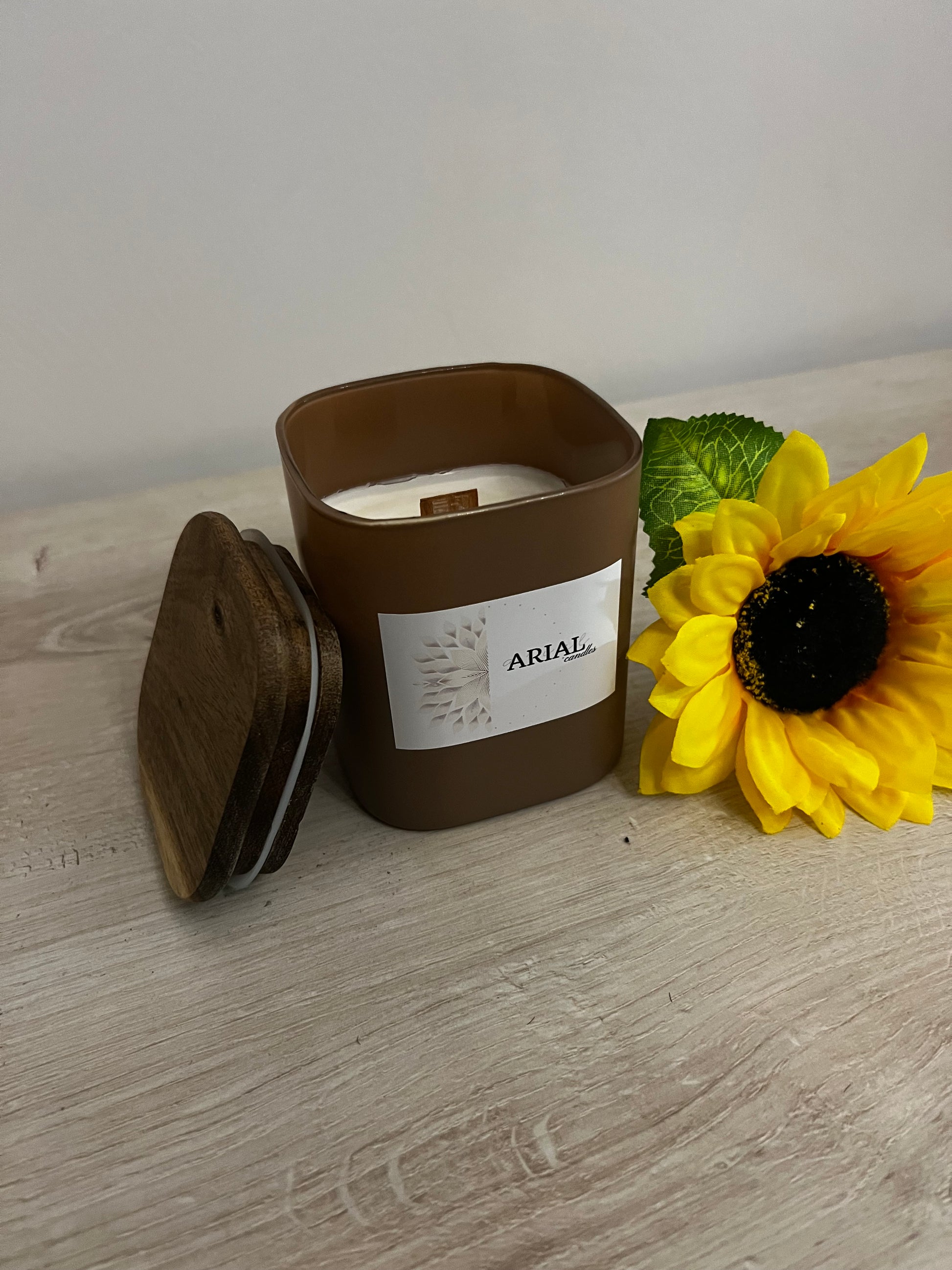 Candela colata a mano, 100% cera di soia, in contenitore di vetro, con coperchio in legno con guarnizione in silicone, per preservare la fragranza nel tempo.